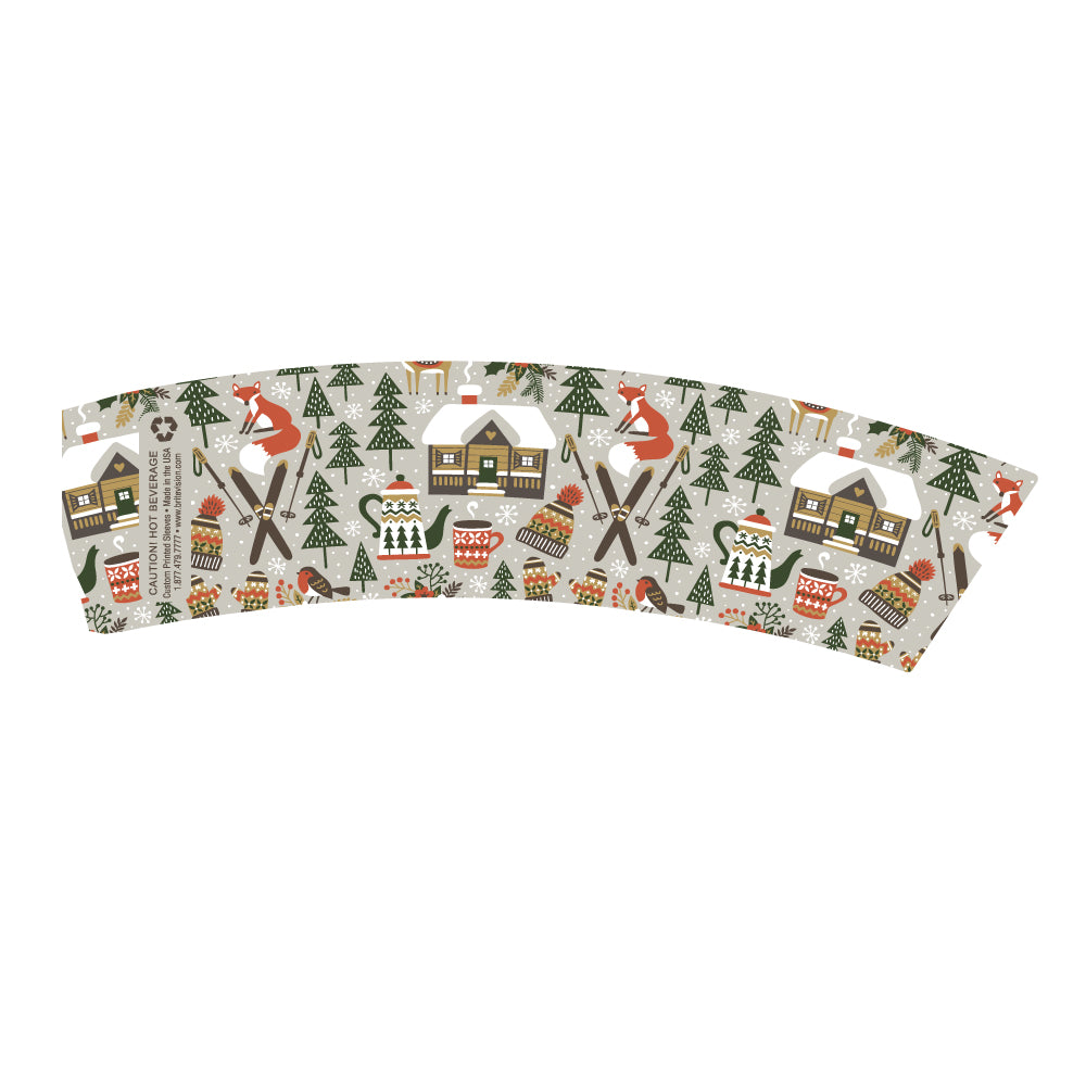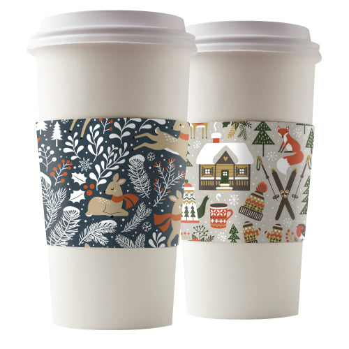 Featuring a charming cottage in a wintry landscape, these cup sleeves add a touch of charm and whimsy to any cup. Perfect for the holiday season or any winter gathering, this design is sure to bring a smile to anyone's face.